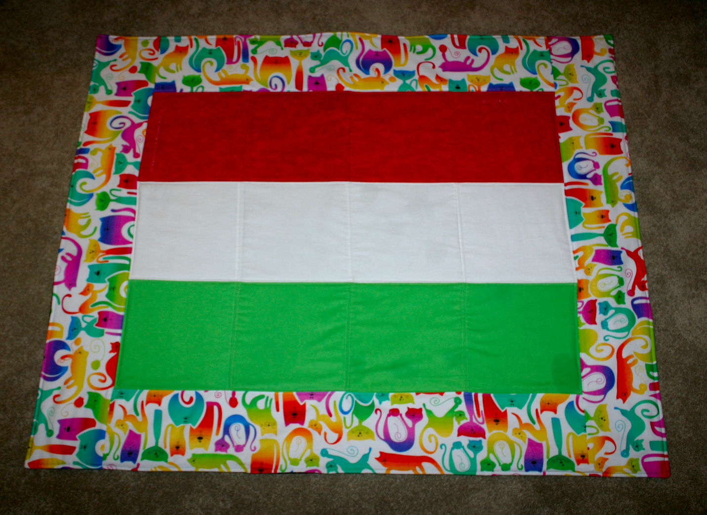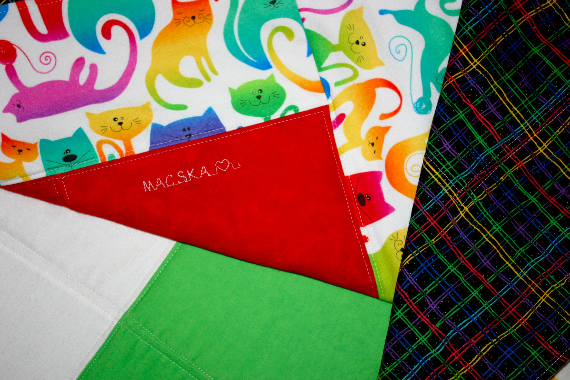 “Macska” is a 1 year old kitty. Her name means “Cat” in Hungarian. The crazy colours in this Maggie May blanket is due to a special request to incorporate the Hungarian flag into Macska’s blanket, and we were proud to do so, as it is also my families heritage.