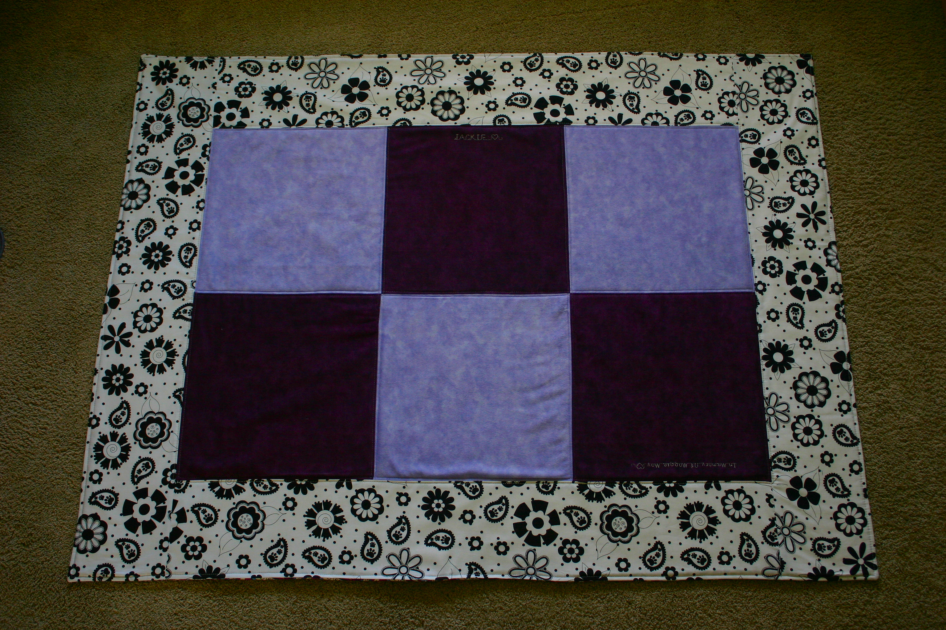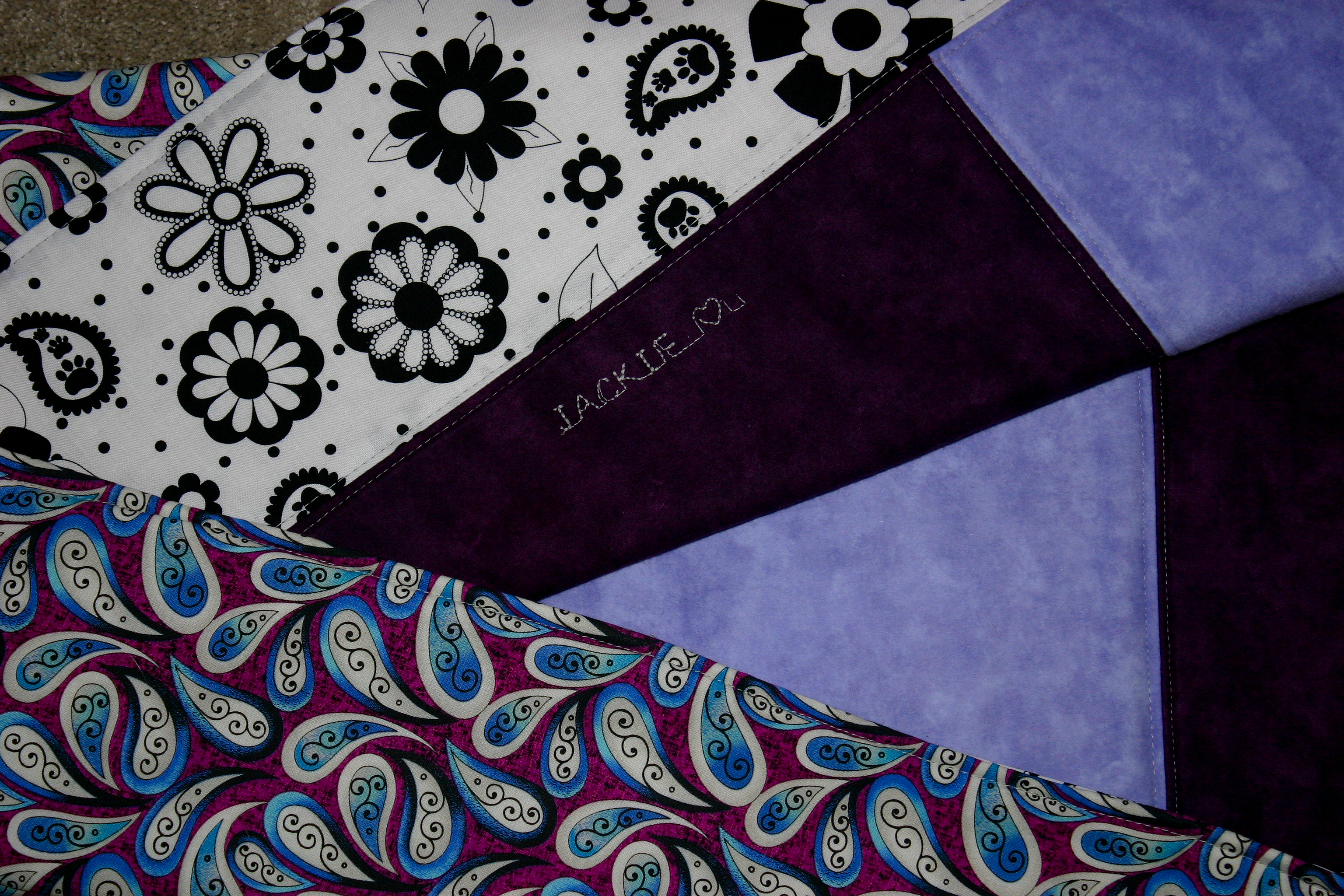 We have been sewing like crazy over the past while to raise funds for our Maggie May account! Our pet blanket quilt tops are ready to be backed and personalized, but every once in a while, one of our creations end up with our very own furry child. As is the case with this purple themed Maggie May blanket. Supervisor Jackie just had to have it, unfortunately she has no money as her wages are paid in doggy treats and belly rubs. However, a secret admirer came up with the cash….aka her MOM, and it now lays proudly on Miss Jackie’s favourite viewing spot!