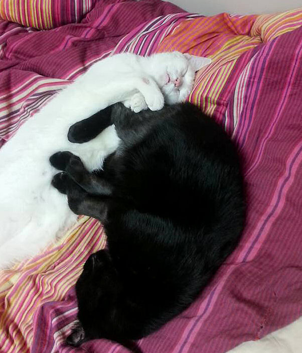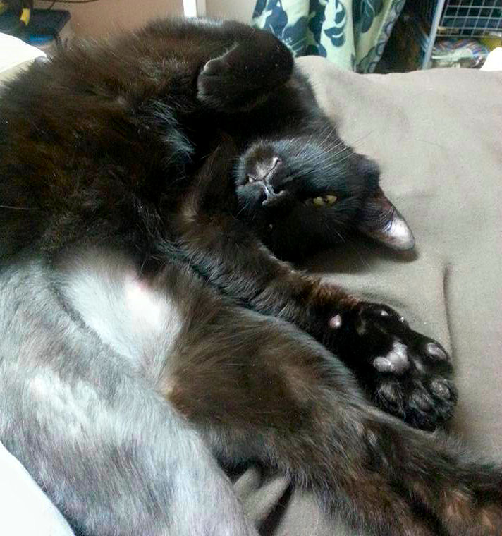 Ninja’s stitches have dissolved and his staples have been removed. His fur is growing back nicely and he is now able to roam about the house during the day ….. but still no jumping, and he knows it! His best bud Moemoe is happy to have Ninja back to play and cuddle with, and is quite ok with Ninja being without a tail. We are so happy for Jesse and his kitties, it’s amazing Ninja survived being caught in a car engine.
