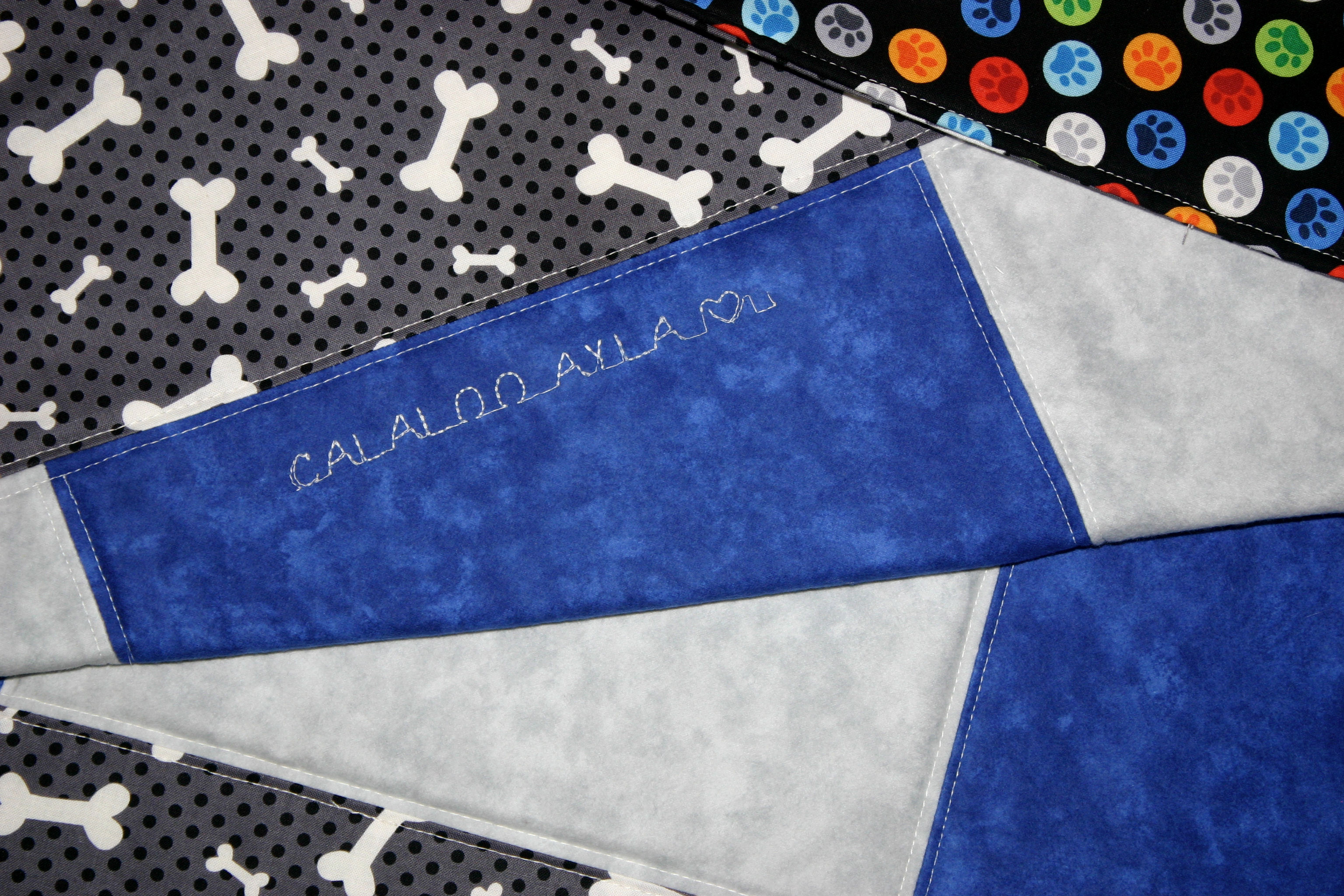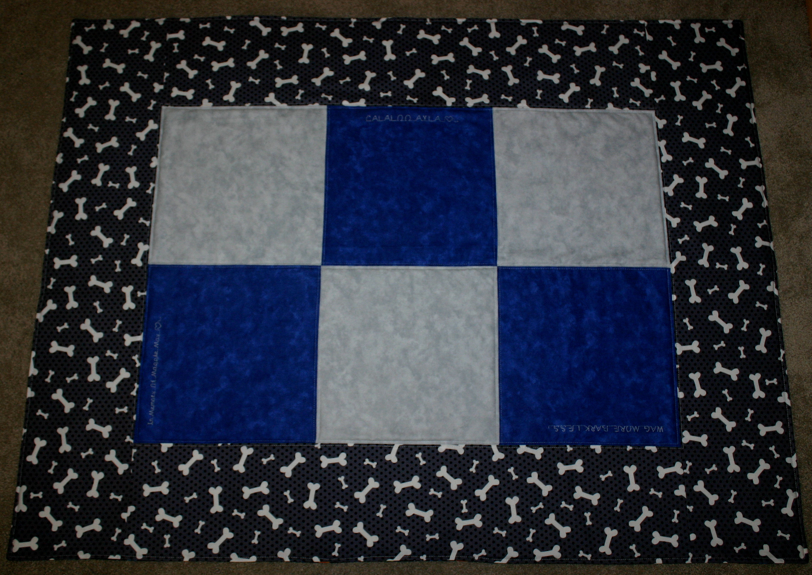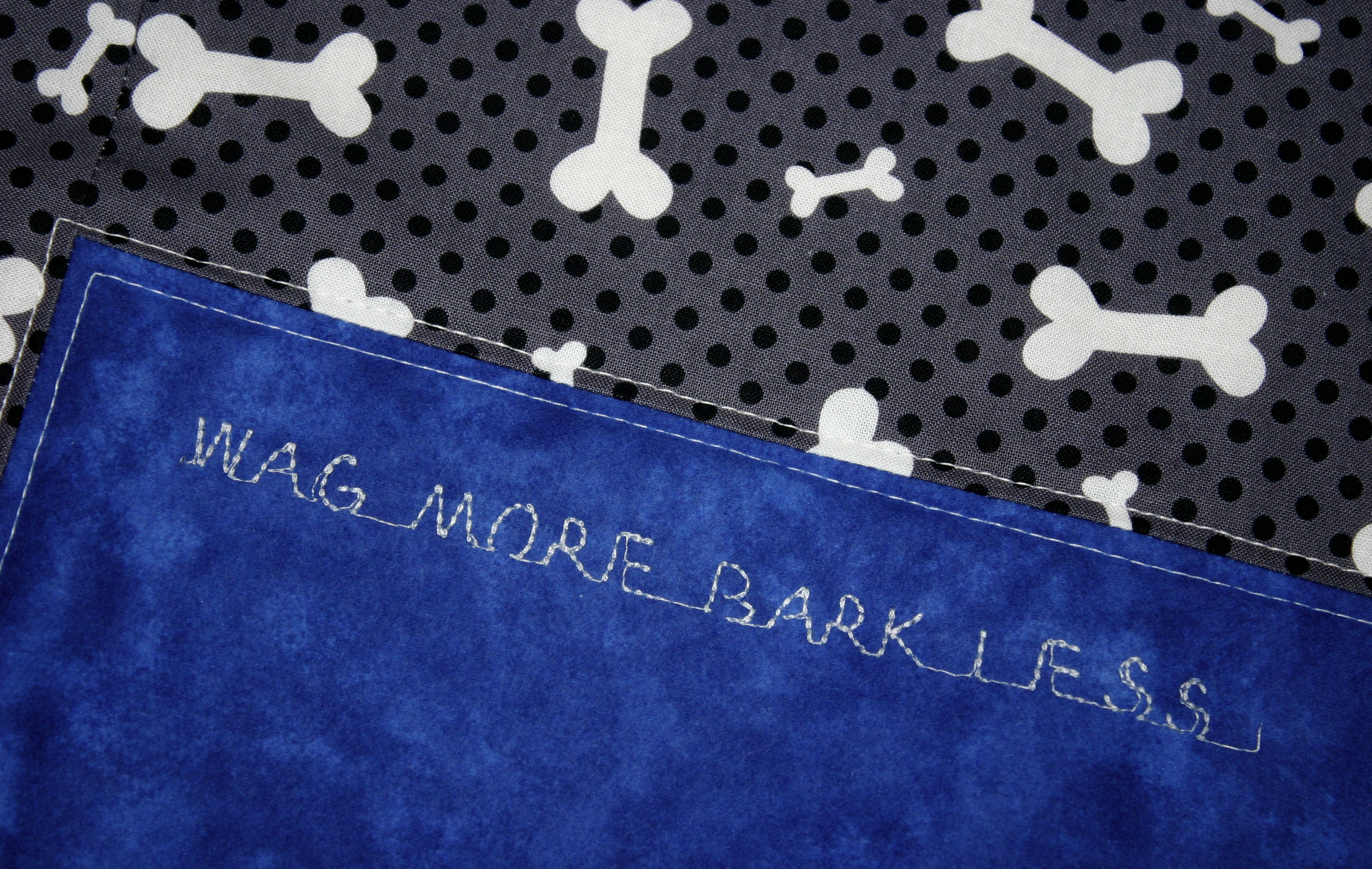Ayla was the proud winner! They could hardly wait to pick up their custom quilted pet blanket today, created in her Mom’s colours, blues and silvers. We also did the honours and embroidered their Moto ….. “WAG MORE BARK LESS”. Great words to live by!