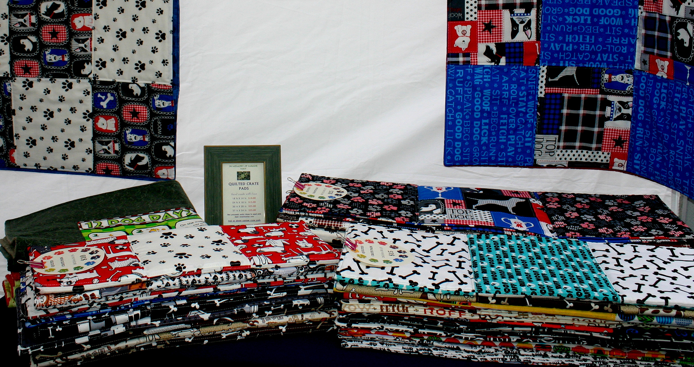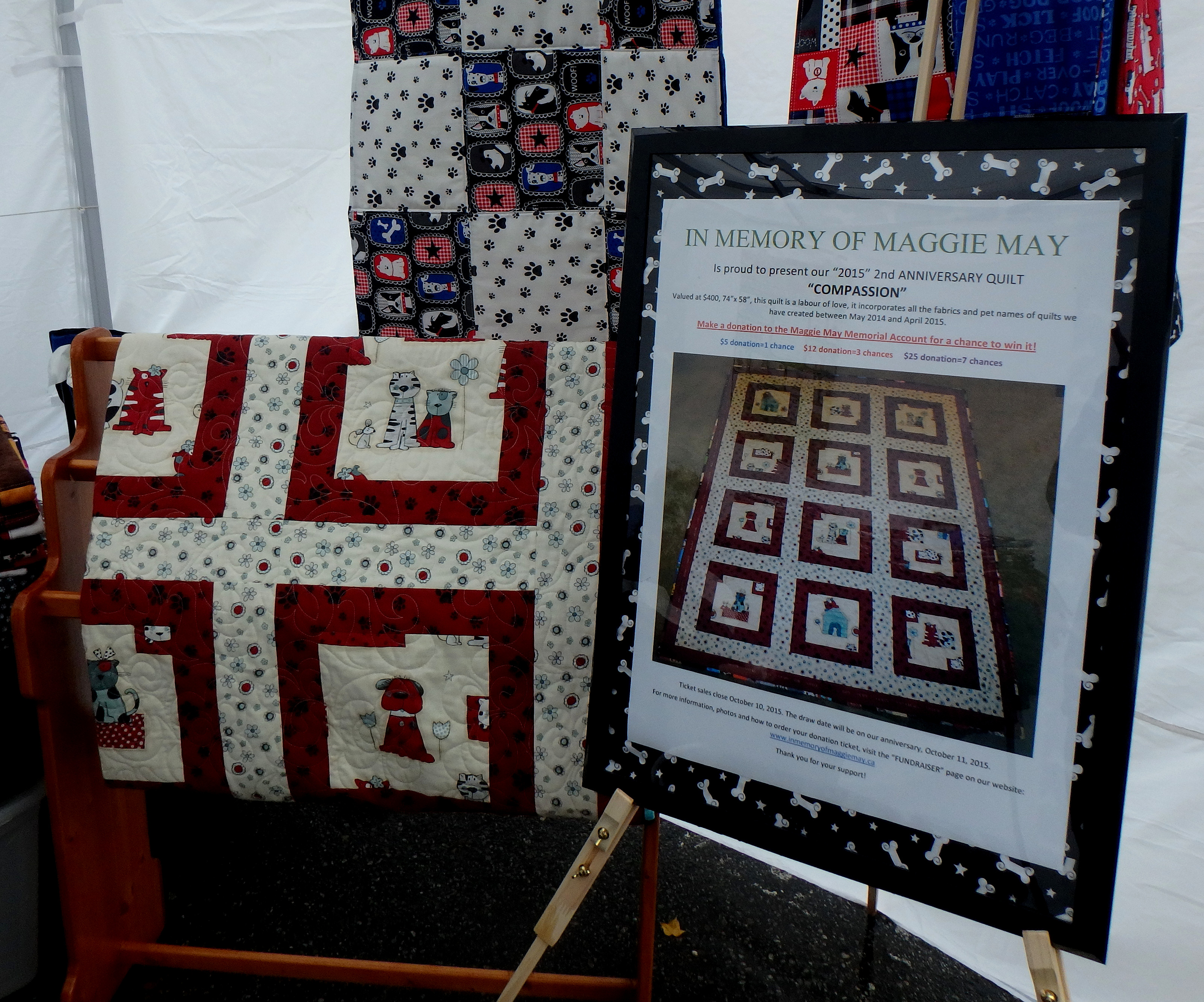 We think most of the doggies were snuggled someplace warm, but Maggie & Hugo dropped by for a visit! The Korna girls were awesome, they helped set up our canopy and surprised us with a donation from their own gift basket raffle! We met some lovely other humans too, they donated for a chance to win our anniversary quilt and are spoiling their furry ones with some special custom work.
