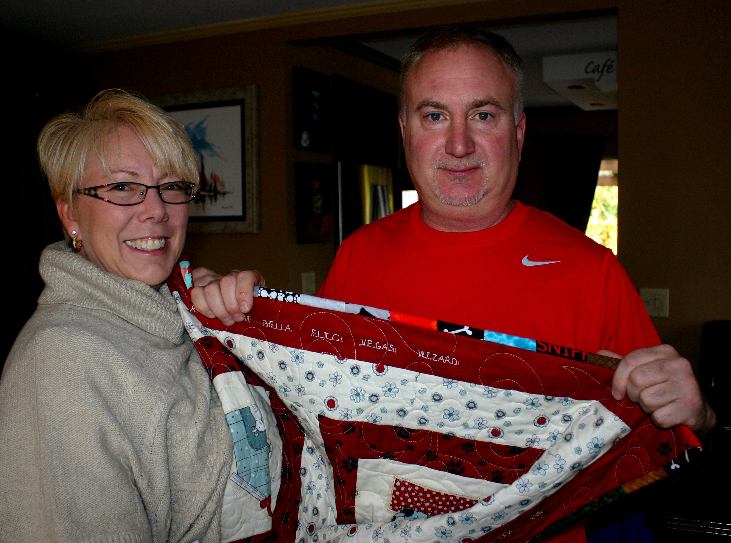 This afternoon, we had the pleasure of presenting our 2015 2nd Anniversary Quilt “Compassion” to Elio & Vegas. Elio & Vegas, along with their humans, Kim & Rob, are the winners of this years donation raffle that raised $502 for the Maggie May fund. They loved the quilt, it was more than they ever expected and have the perfect spot for our creation. We thank everyone for their support, and Kim & Rob, especially want to thank the girls at Pet Food N More, for pulling their ticket!