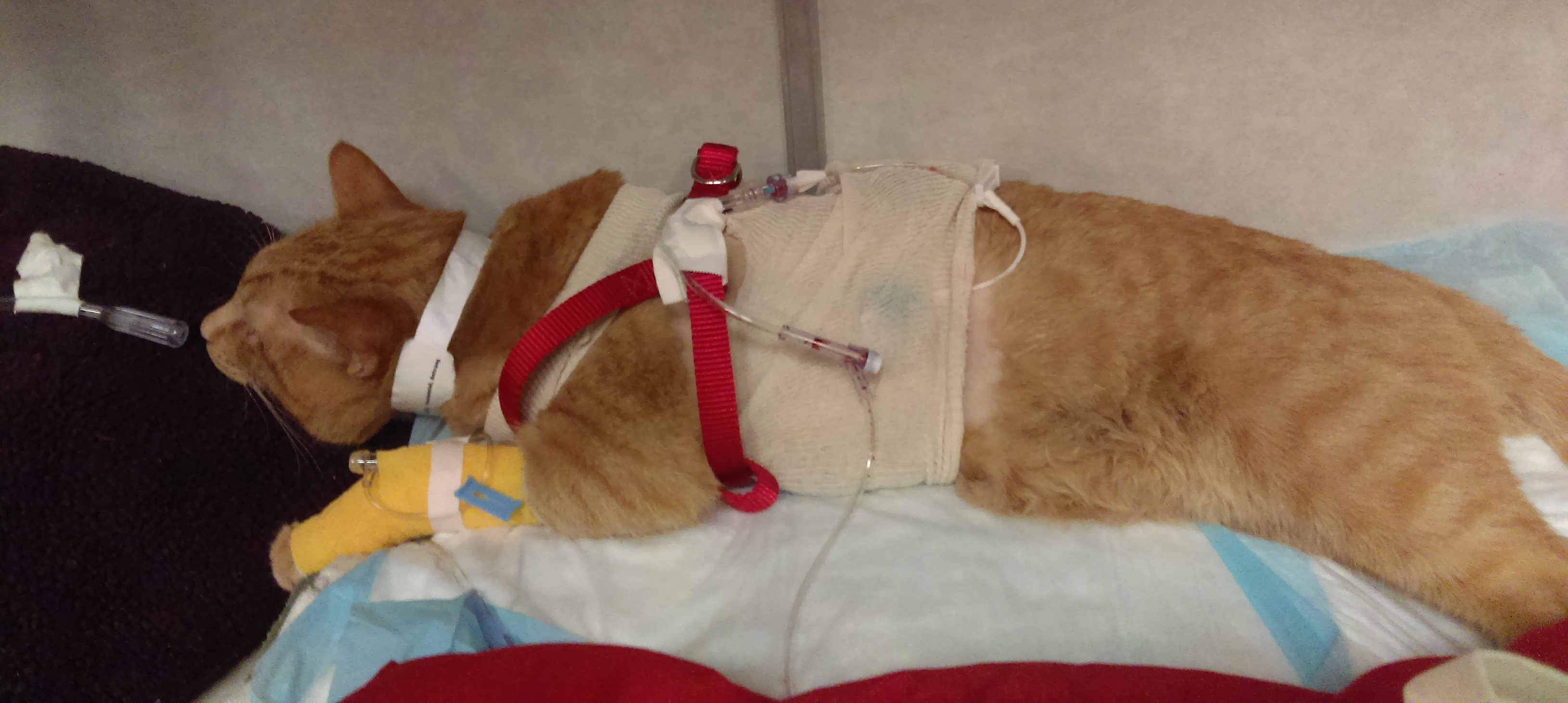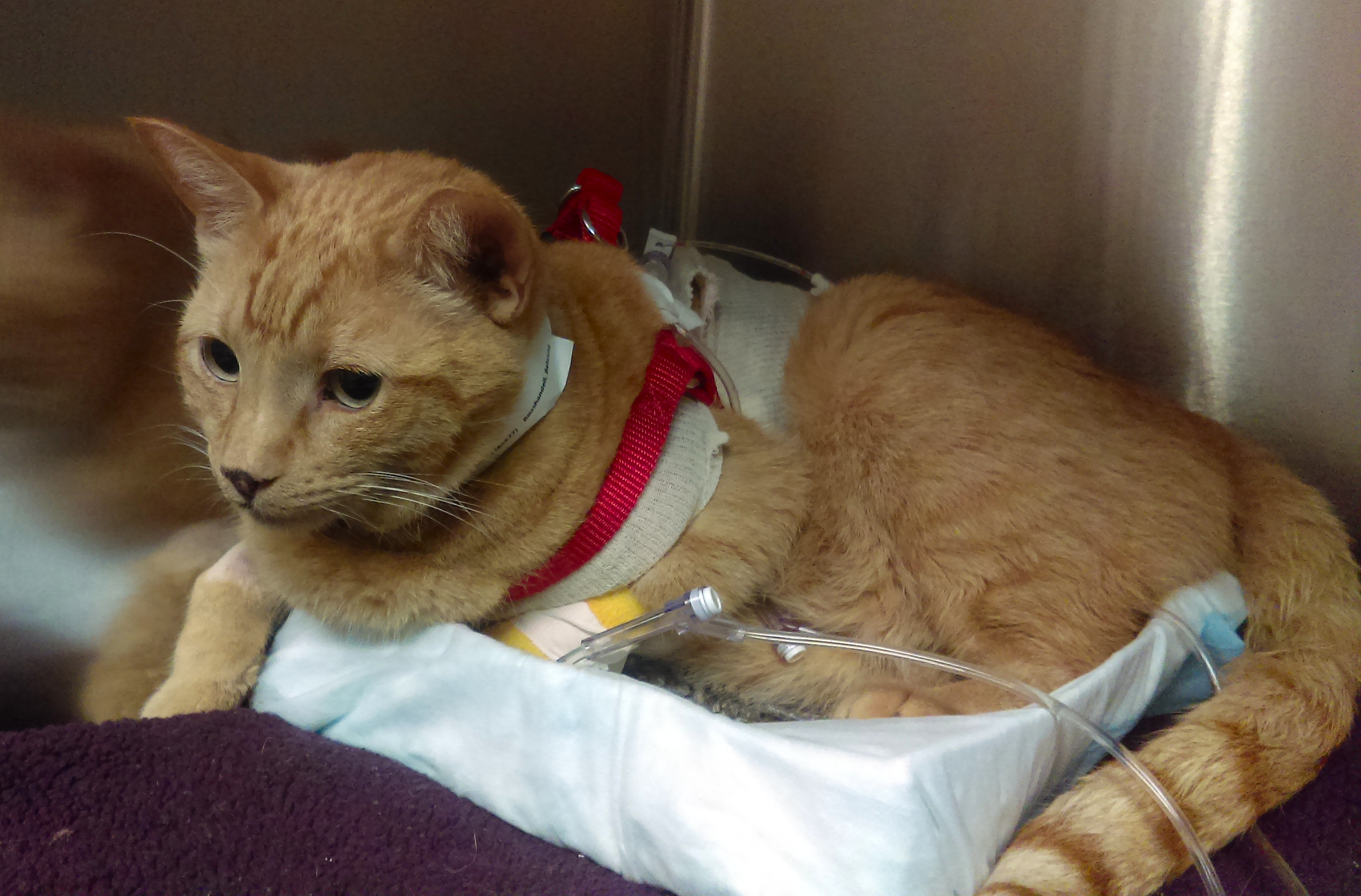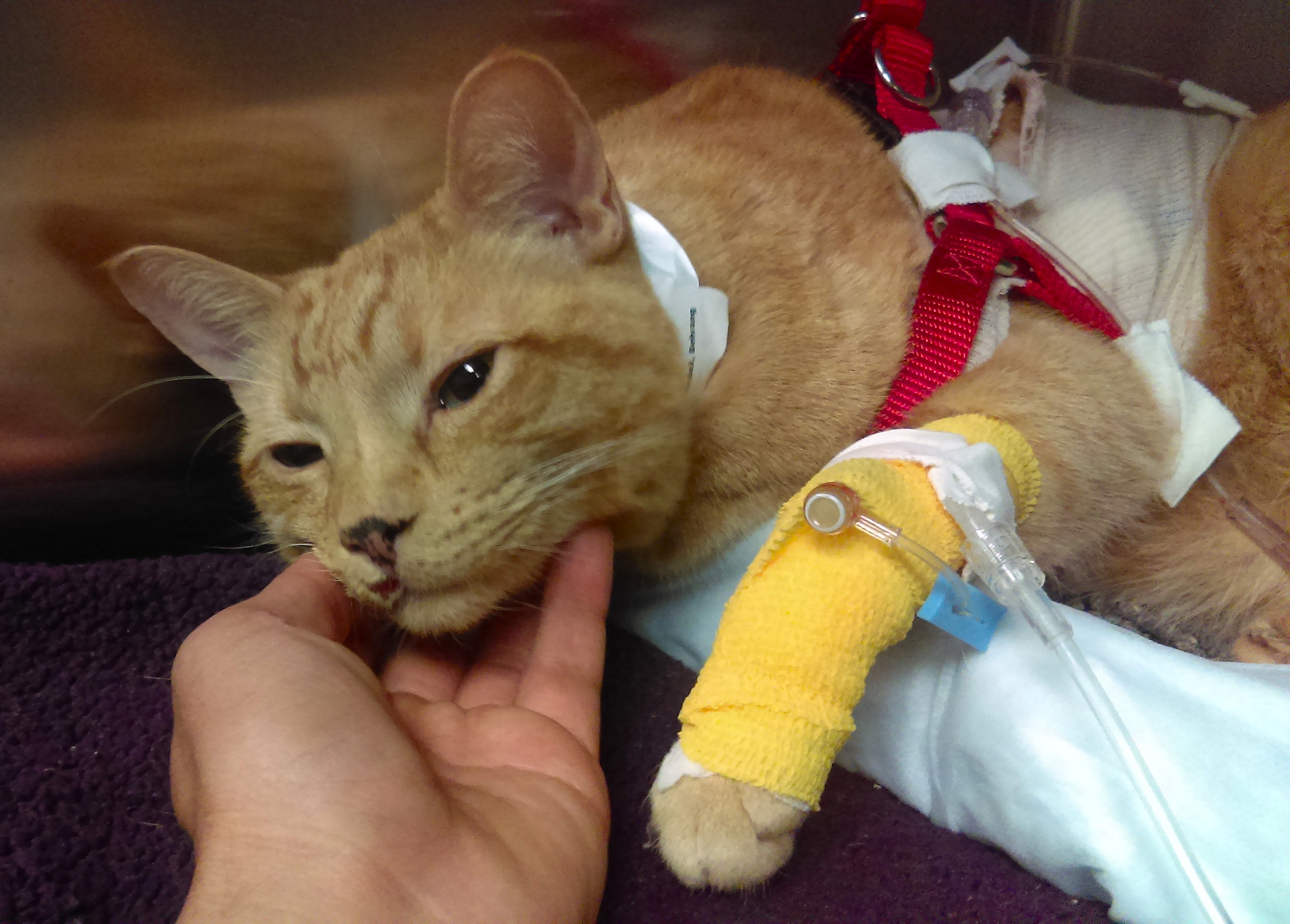 We are happy to report that Torres is now home. Ben says “he is groggy and wobbles around when he walks, but he is eating and drinking water, and purrs when we cuddle with him”. He is slowly improving, and the best news is that there is a low probability that he will need surgery, he will hopefully heal on his own. He has a long road to recovery ahead of him, and the next 8 weeks are crucial, no jumping around on the furniture!