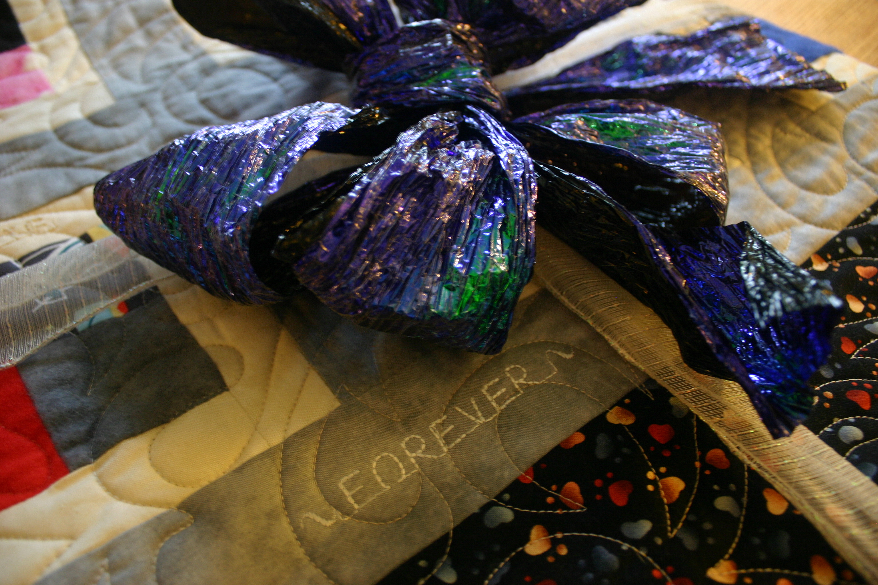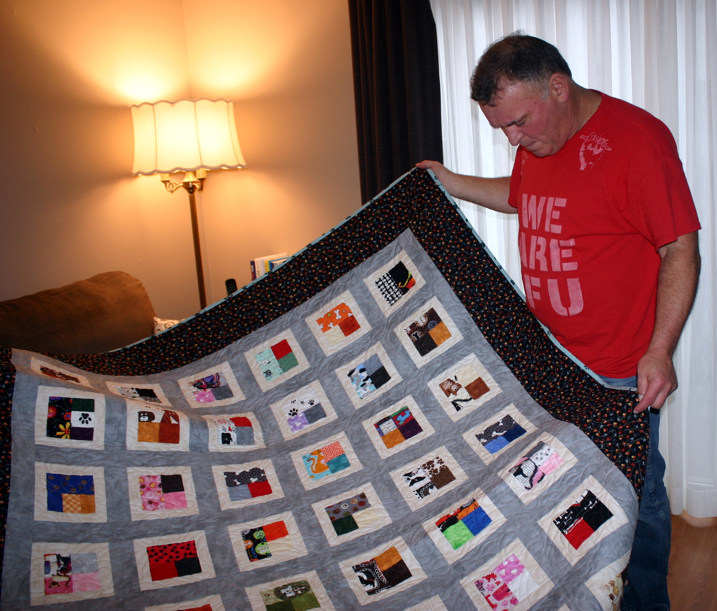 This afternoon we had the pleasure of presenting our Anniversary Quilt to the excited winner of our donation raffle, Dan Townson and his sidekick Rocco. He had great interest in the making of the quilt and was quite impressed (thanks to Tammy for the amazing long arm work). He also told us that his kids have called “dibs”. Our quilt was quite the hit with many memories behind each of the mini quilts.