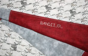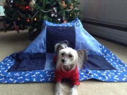 Bandit received his first Maggie May blanket a few years ago, all in blues, with a special request for a future blanket with Chinese Crested pups if we ever came across some.