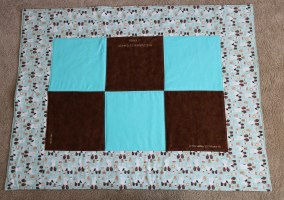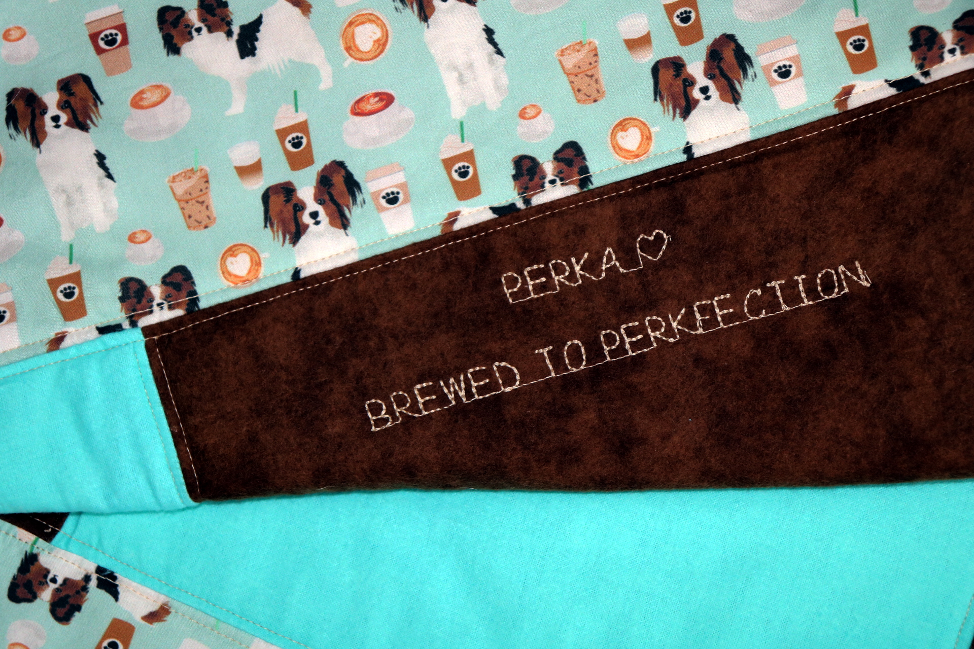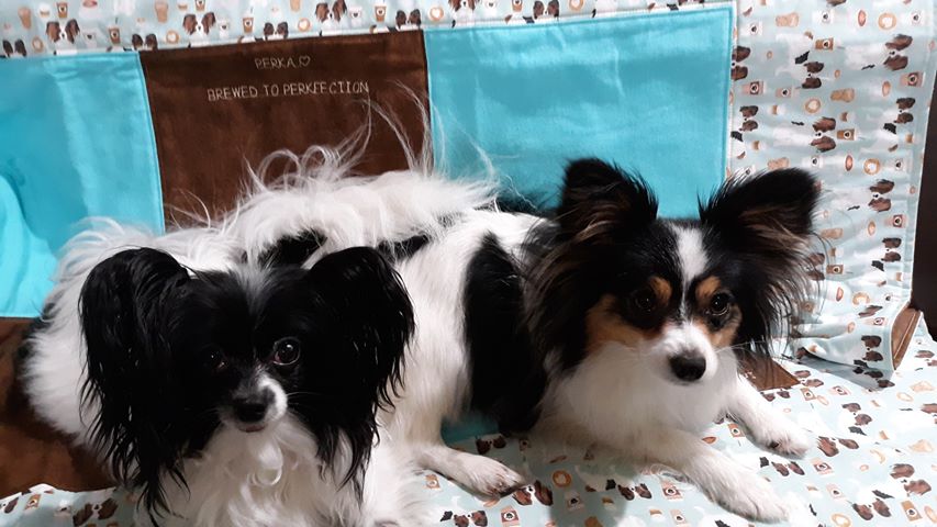 This is Perka, also known as “Brewed to Perkfection”, whose Mum who loves quilts and papillons. She noticed a quilt we had made using Spoonflower fabric, so she ordered the print she liked from then and shipped it to us to make a one of a kind quilt for her girl. We love how it turned out, and colours suit her girl Perka, perkfectly!