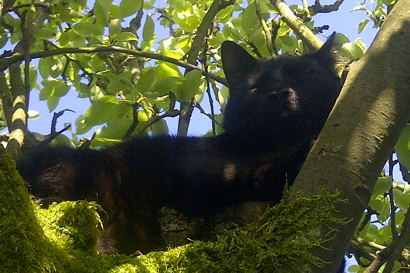 Ninja enjoys climbing to the very tops of trees, to get the best view. Ninja has been seen climbing trees that almost any other cat would get stuck in. He hangs onto the trunk and makes tiny hops in a circle going down while looking up, once he is low enough, he just jumps down.