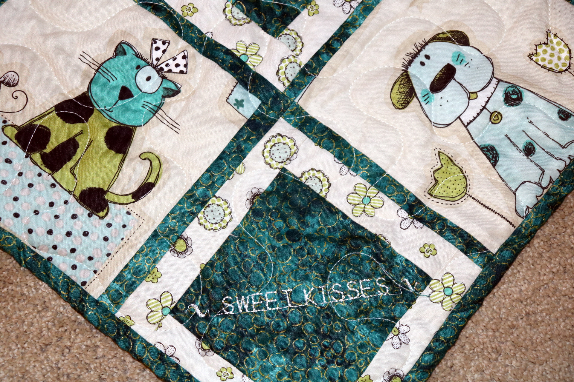 We have named this years anniversary quilt “SWEET KISSES”. No matter, if its a quick lick on the cheek, or a nose rub, or a slobbery french kiss, its all about the undeniable love our pets have for us humans. How empty our lives would be without them.