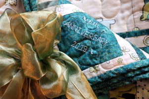 Our amazing friend Tammy of Sugar Town Quilting Co, in Cranbrook who once again donated her time and cost to professionally quilt our creations. We were also late again getting the quilt to Tammy but she did it right away for us and we got it back just in time for us to finish by reveal. Tammy has quilted all our anniversary quilts, and it’s her beautiful work that makes our quilt that much more special.