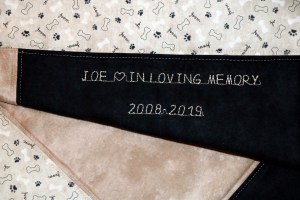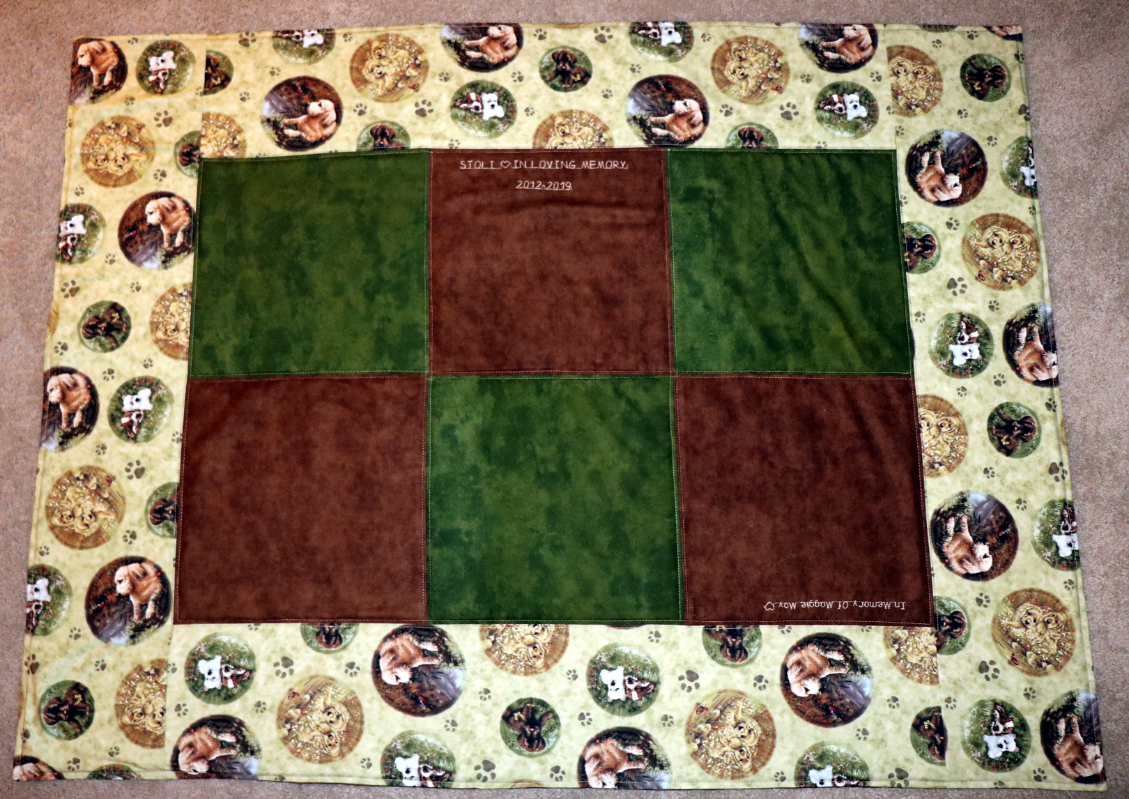 Our quilt includes the fabrics and names from our personalized blanket orders between May 1, 2018 to April 30, 2019. This gives us time to design, create, and have it professionally quilted in time for the reveal on September 12th. We will once again raffle it off on our anniversary October 11th, the anniversary of Maggie’s crossing over the rainbow bridge, with all proceeds going to the Maggie May Fund.