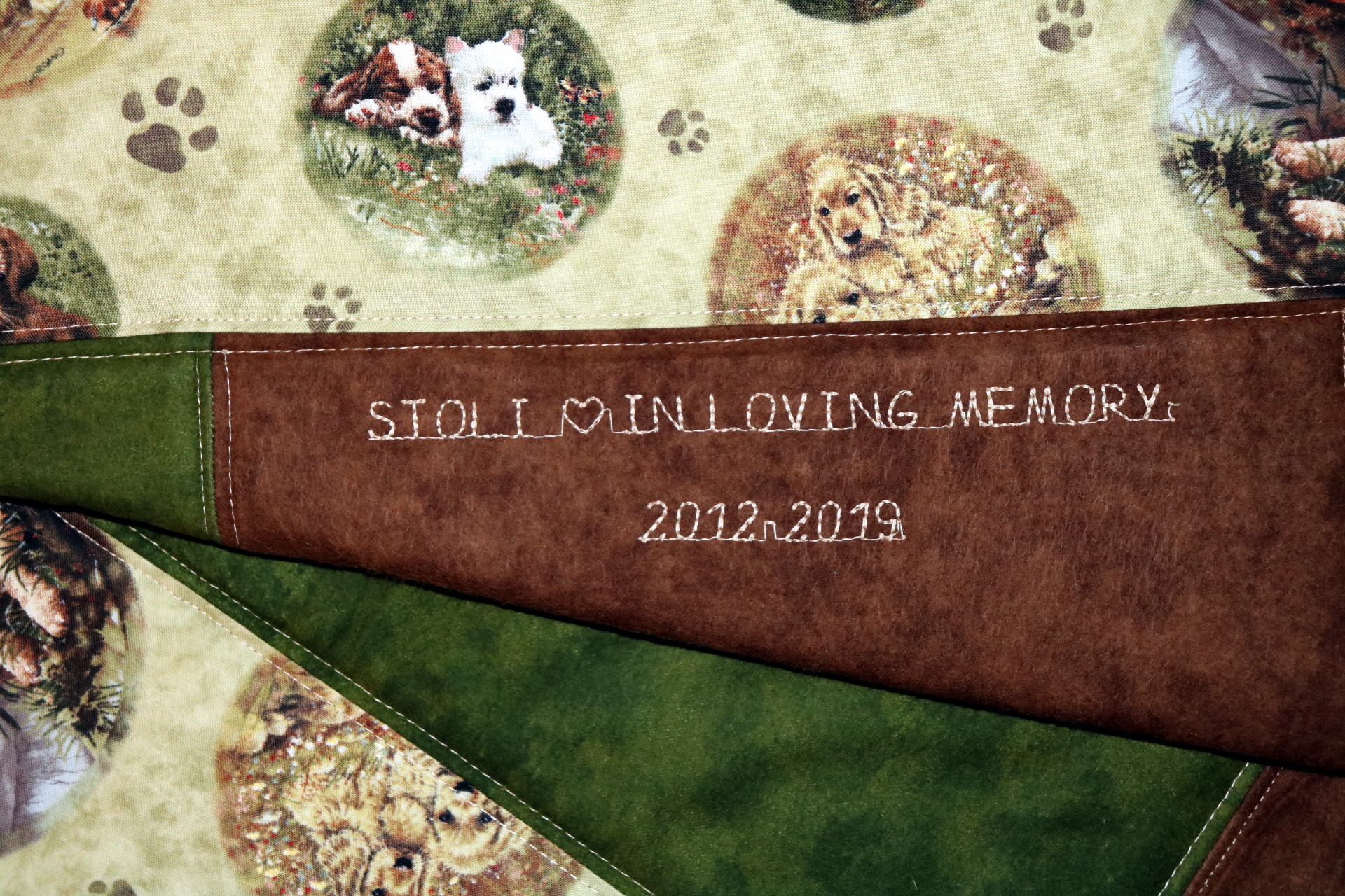 We are dedicating our quilt to the furry friends we have lost this year …. Rainier, Maddison, Cubby, Squirt, Elijah, Jiggs, Annie, Dudley & Diesel. Forever loved and forever missed.