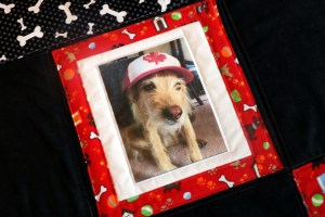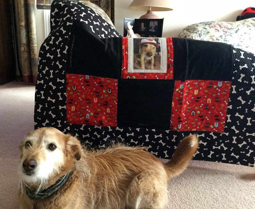 This is Perka, also known as “Brewed to Perkfection”, whose Mum who loves quilts and papillons. She noticed a quilt we had made using Spoonflower fabric, so she ordered the print she liked from then and shipped it to us to make a one of a kind quilt for her girl. We love how it turned out, and colours suit her girl Perka, perkfectly!
